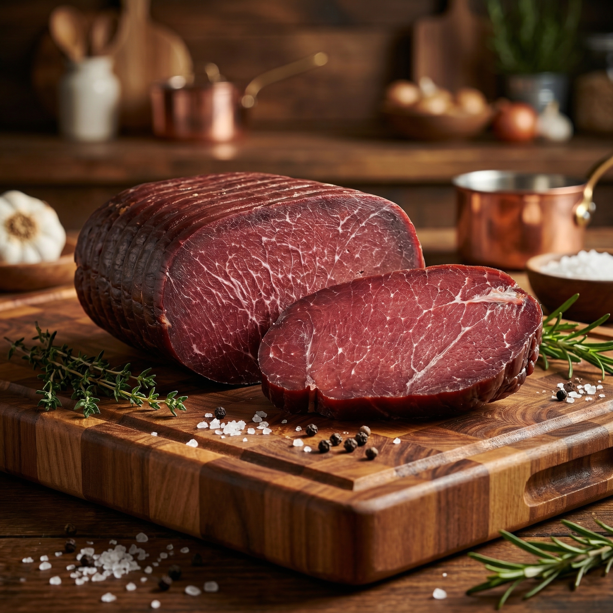 Брезаола из мраморной говядины породы Angus — подлинная жемчужина итальянской гастрономии. Для неё используют отборное свежее мясо, известное своей мягкостью и выразительным вкусом. Согласно классической технологии, бедренную часть выдерживают не менее 40 дней с натуральными специями — благодаря этому брезаола раскрывается насыщенным пряным ароматом и ярким, глубоким вкусом.