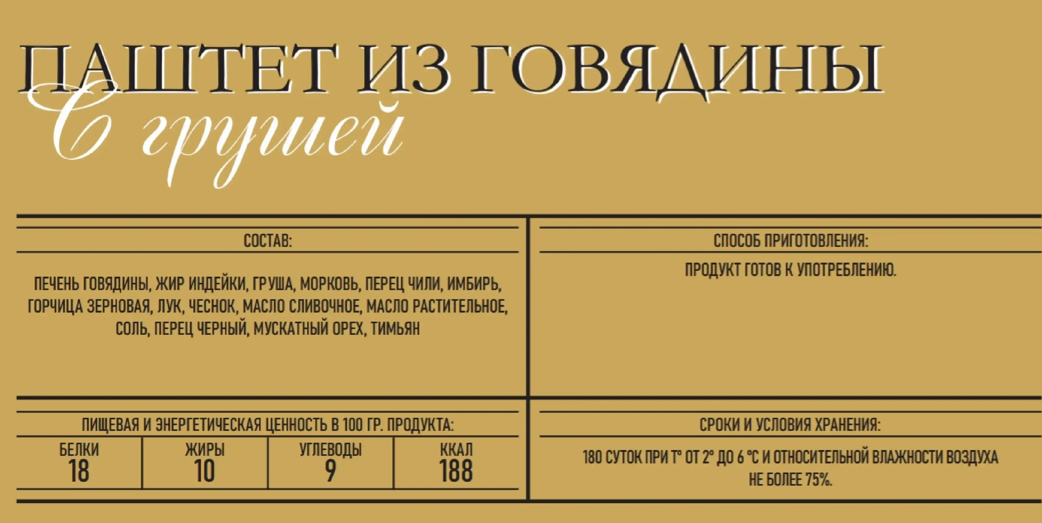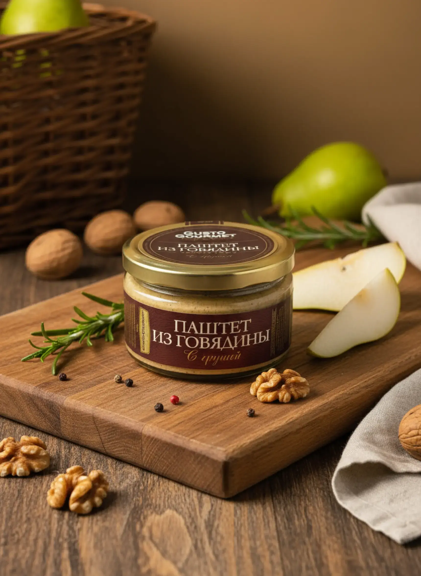 Откройте для себя изысканный паштет из говядины с нотками сладкой груши! Нежная текстура, гармоничное сочетание вкусов и натуральных ингредиентов подарят вам истинное удовольствие. Используйте как закуску к вину, начинку для бутербродов или добавку к праздничному столу. Ваш идеальный выбор для гурманов и ценителей качественного питания!